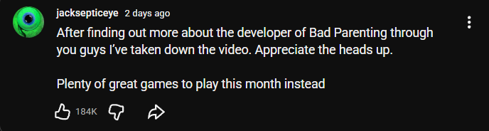 I hadn’t heard of this game and I don’t keep up with Jacksepticeye, but it seems like the developer of that game is in hot water over some predatory behavior (YouTube link).
